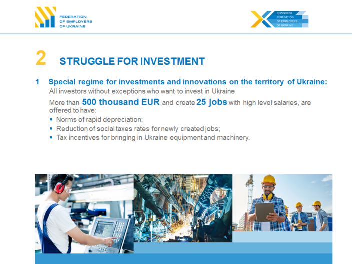 Plan of Modernization of Ukraine, which was presented and approved at the Congress of Federation of Employers of Ukraine, started its implementation from stimulating investments in Ukrainian economy. A draft law №3544 about the special regimes of investment and innovation activities with using the principal of subsidiarity is registered in the Verkhovna Rada. The initiator of the development of the draft law in the summer of this year was the Federation of Employers of Ukraine and the initiative of industrialists was supported by the group of experts and members of the Parliament headed by Anatoly Hirschfeld.